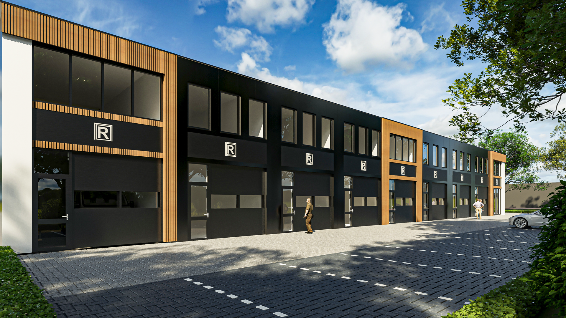 Het bedrijfsverzamelgebouw krijgt een moderne en tijdloze uitstraling door het gebruik van donkergrijze geveldelen, witte accenten en houten elementen. Hierdoor blijven de units ook op lange termijn representatief. Deze specifieke unit is niet gelegen op een zicht locatie.